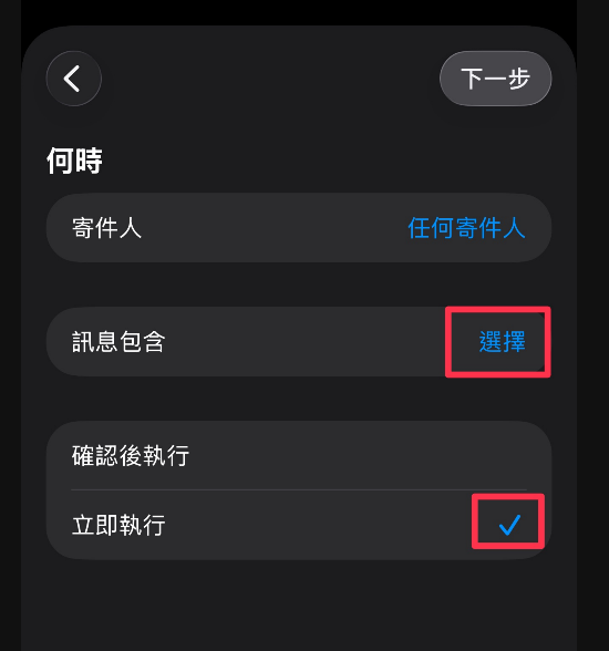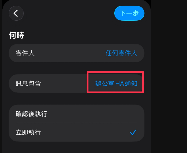 進來後選擇 將確認後執行改成立即執行 以及 訊息包含裡面去設定關鍵詞