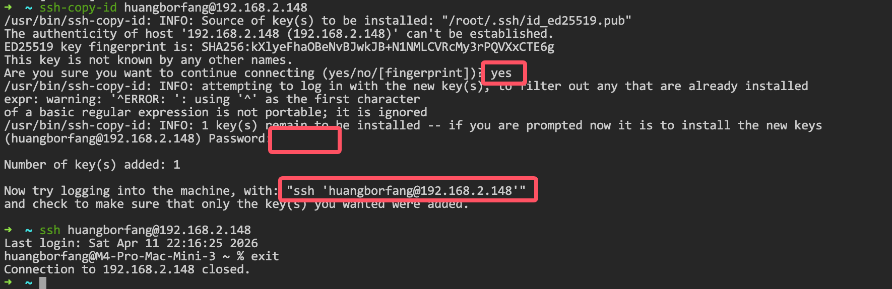 輸入yes 還有mac 密碼 就可以不用輸入密碼 ssh 登入mac